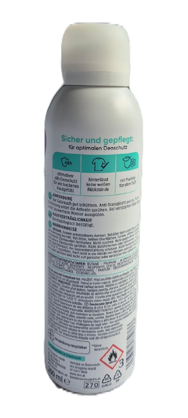 Balea 5-in-1 Protection Anti-Transpirant Spray provides reliable and long-lasting protection against sweat and body odor for up to 48 hours. Its advanced formula offers effective odor control while helping prevent white residue on clothes and yellow stains on fabrics. Designed for daily use, it is gentle on the skin and free from alcohol (ethanol), making it suitable for sensitive skin.The spray delivers a fresh, clean feeling and fast-drying comfort, ideal for active individuals and hot climates